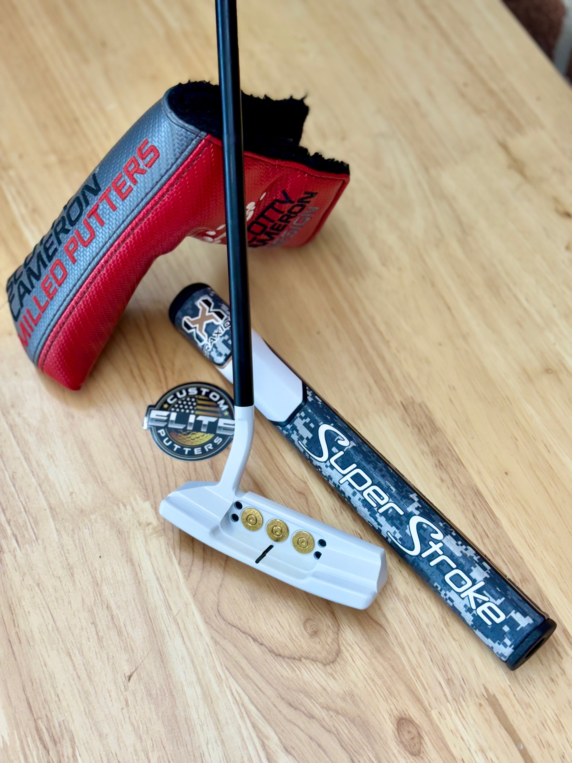 (Refurbished) Scotty Cameron Select Newport 2 finished White Cerakote with Black and Gold Paint Fill. New White Shaft. Bullet Back Inserts. Right Hand any shaft Length. Includes a new Super Stroke grip and Head Cover
